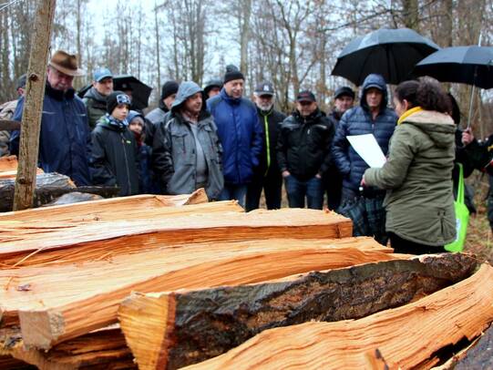 Versteigert wurde Laubholz mit hohem Brennwert, darunter Buche, Eiche, Roteiche und Kastanie. Insgesamt kamen 108 Ster Brennholz unter den Versteigerungshammer von Ortsvorsteherin Pamela Otteni-Hertwig und Förster Hubert Huber. Der Anschlagspreis lag bei 80 Euro pro Ster zuzüglich 7% Mwst. Marion Drebes von der Ortsverwaltung führte Protokoll.