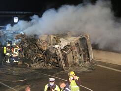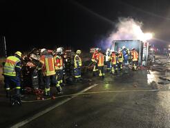 Beim Eintreffen der ersten Einsatzkräfte stellte sich heraus, dass es sich um einen Fahrzeugbrand eines LKW nach einem Verkehrsunfall mit einem PKW handelte. Der LKW stand in Vollbrand, Betriebsstoffe und Trümmerteile verteilten sich brennend auf einer Strecke von 100m in beiden Fahrtrichtungen. Der PKW wurde auf Grund des Unfalls auf die Mitteltrennwand geschleudert. Der Fahrer des LKW konnte sich aus seinem Fahrzeug selbst befreien, für den Fahrer des PKW kam jede Hilfe zu spät, er verstarb noch in seinem Fahrzeug.