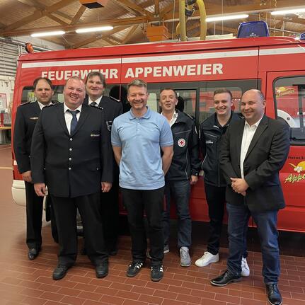 Foto von links nach rechts: Klaus Huber (Abt.-Kdt Urloffen), Christian Brudy (Abt.-Kdt Appenweier), Jürgen Stäbler (Kommandant Feuerwehr Appenweier), Viktor Lorenz (Bürgermeister), Jürgen Bollack und Dorian Baas (DRK Appenweier), Jörg Minder (ASB Rettungswache Appenweier)